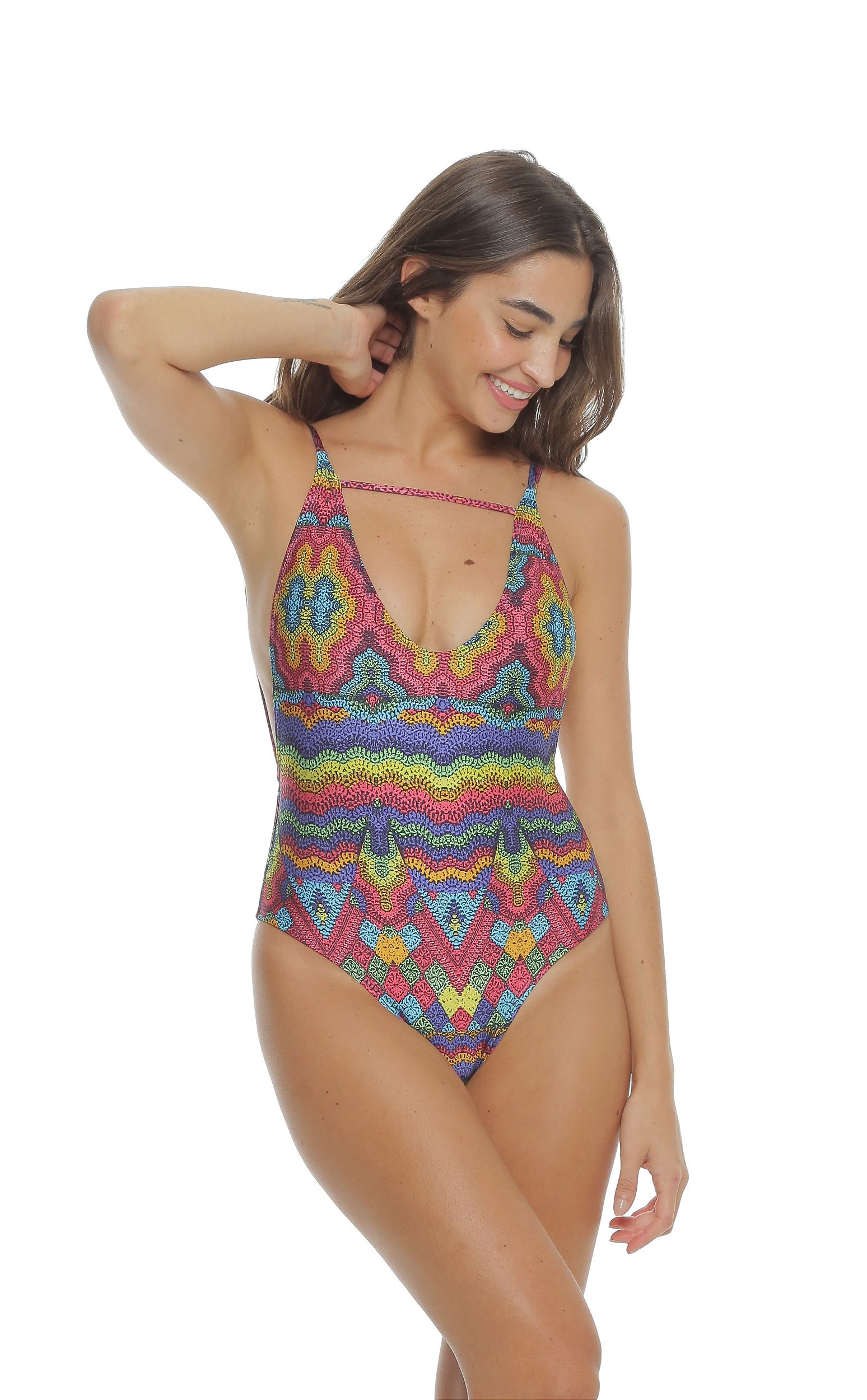 • Maiô decotado, aberto nas costas com tiras.